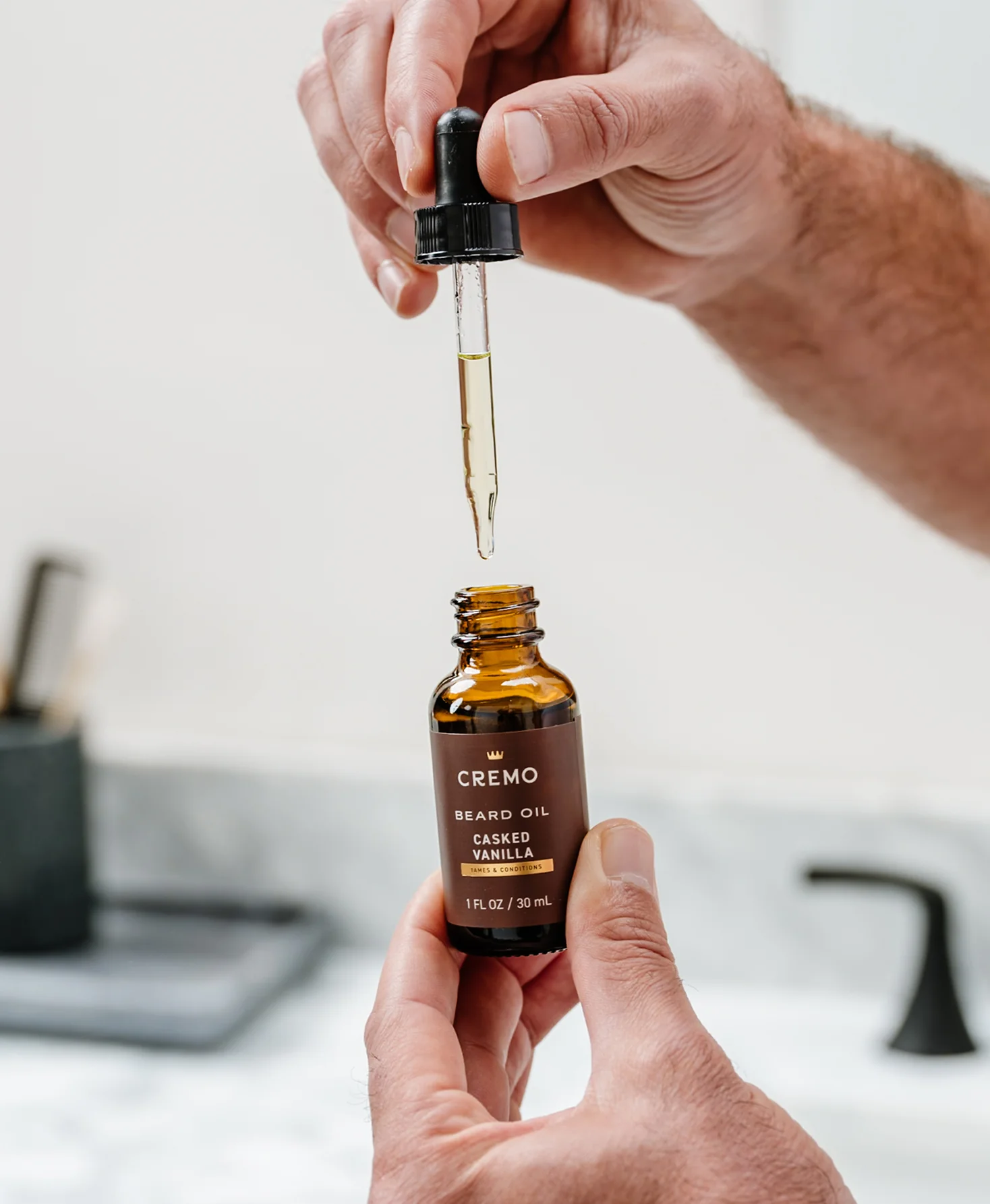Our Casked Vanilla Beard Oil features an intoxicating, creamy scent with notes of black plum, warm incense, and Madagascar vanilla. This deep-conditioning formula contains ingredients like argan and jojoba oils, whose moisturizing properties help soften coarse facial hair and keep your beard looking and feeling top-notch. With our signature multi-layered fragrance, your beard is destined for true greatness. Exceptional and refined—unquestionably Cremo.