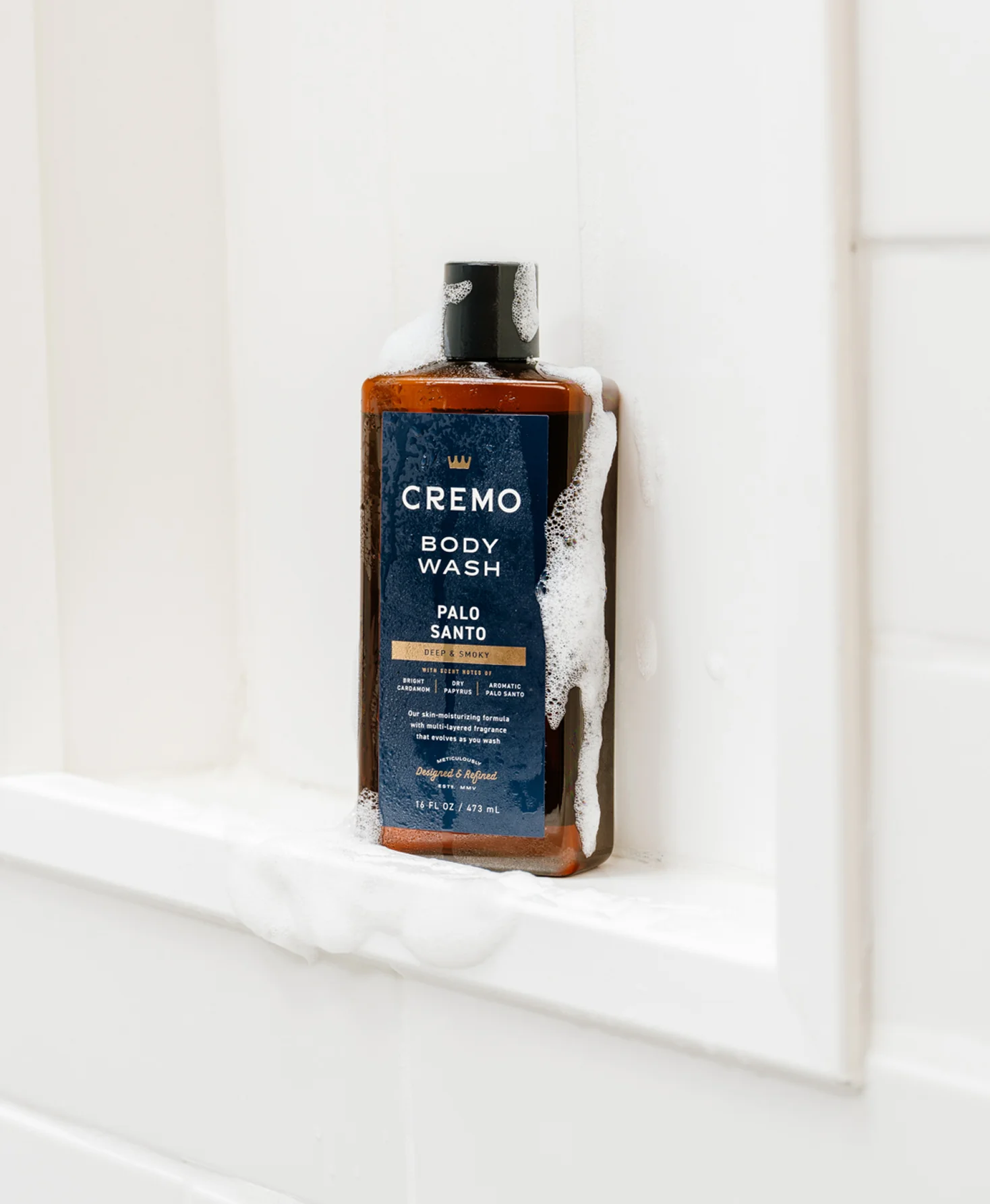 Premium Palo Santo Scent with notes of Bright Cardamom, Dry Papyrus and Aromatic Palo Santo in a rich, lathering body wash. This perfectly-balanced, premium formula helps keep you clean and thoroughly moisturized.
